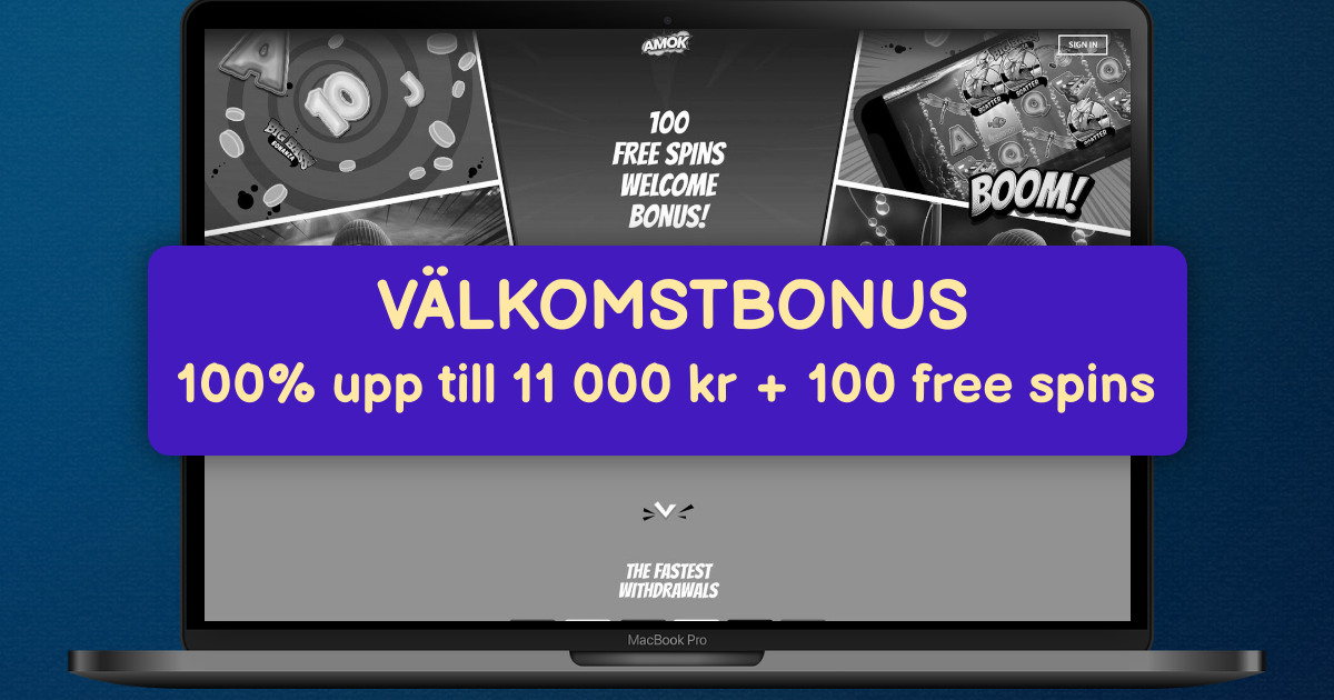 Nya spelare på Amok Casino får en unik välkomstbonus i form av 100 free spins helt utan omsättningskrav. För att kvalificera sig behöver du göra en första insättning på minst 20 euro (cirka 200 kr).